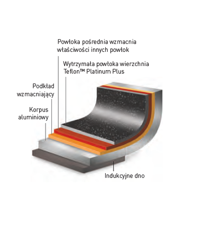 - Trójwarstwowa, „marmurkowa” powłoka zapobiegająca przywieraniu, odporna na wysoką temperaturę (do 260°C) i niezwykle wytrzymała